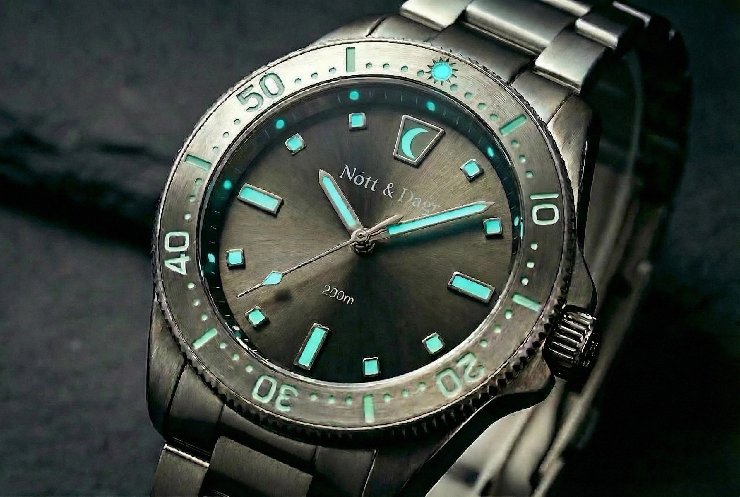 In Norse mythology, Nótt is the goddess of night, and Dagr her son — the god of day. Together they ride their chariots across the sky in an endless cycle. The Founder's Edition is built around that duality: a crescent moon at 12 o'clock on the dial, a sun motif on the bezel above it. Night and day, held in tension on a single dial.